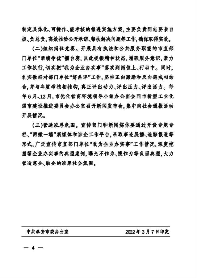 中共泰安市委辦公室泰安市人民政府辦公室印發(fā)關于開展我為企業(yè)辦實事活動的實施意見的通 知